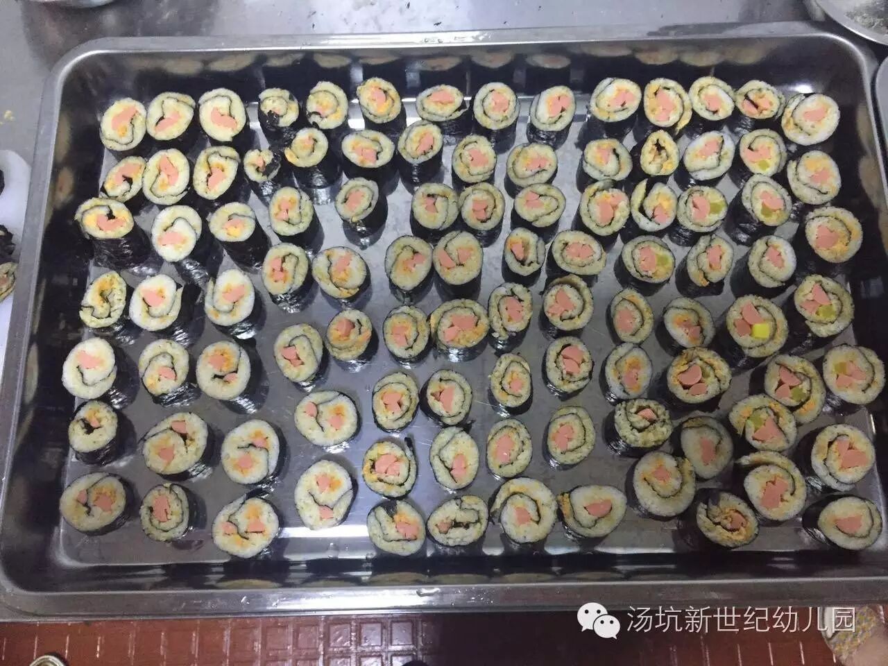 寿司是一种美味小吃,大人们喜欢,我们的孩子更喜欢。昨天幼儿园的厨房里溢满了香甜气息。脆脆的海苔、香喷喷的米饭包裹着甜甜的沙拉酱、爽口的黄瓜、美味的火腿肠和肉松,哦!原来食堂的工作人员又在制作一道精美的美食—寿司。