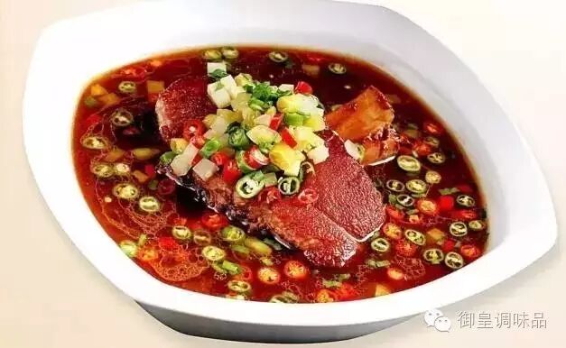 2.把青红小米辣圈、蒜泥、芹菜花和野山椒圈放盆里,加入鲜汤、盐、醋、御皇鲜露、珍膳味五谷原味鸡精和青花椒油拌匀以后,倒进装猪肘的盘里,即成。