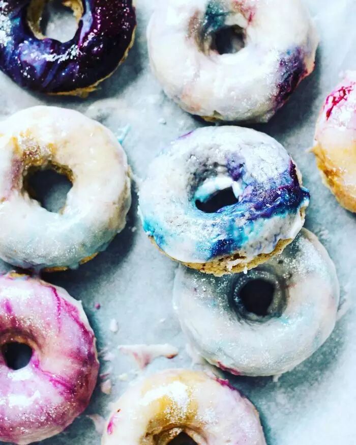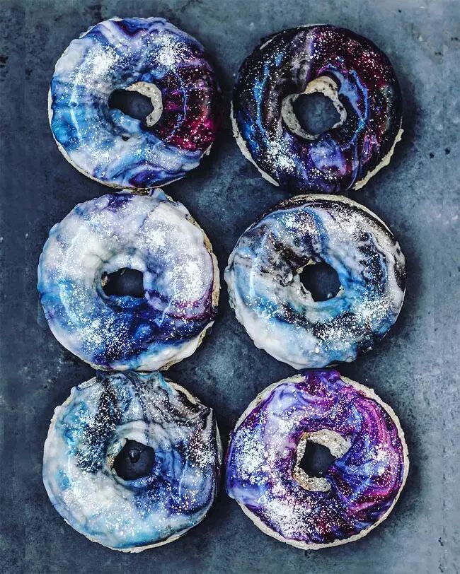 Sam Melbourne 也做出了同样星际、银河感的甜甜圈,虽然外型上没有 Hedi Gh 的精致,但她标榜著这是颗素食主义的星系,而且这素食的甜甜圈,更是为了她生病的男友所打造的,除了外型很美之外,用意也很美。