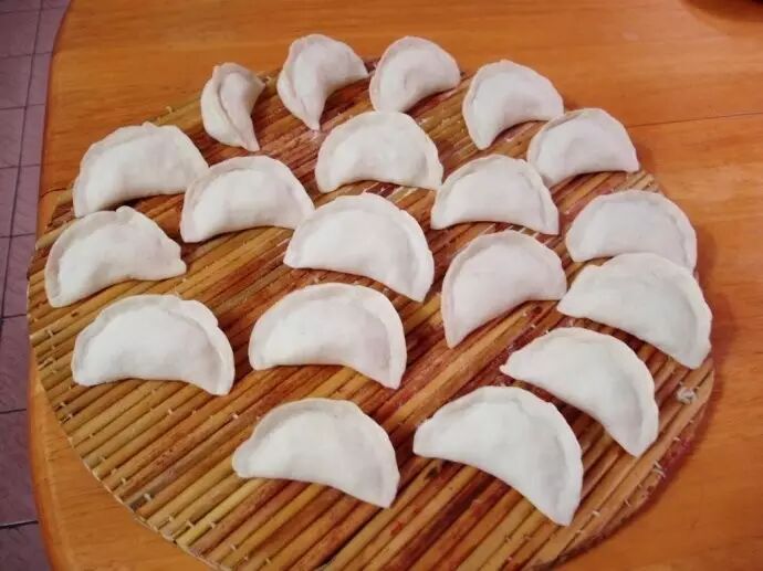 制作:把裹好陷的面皮对折,捏紧口,然后把对折后形成的两个角捏在一起即可。这个形状很好看。