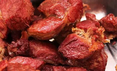 曹县烤牛肉以体格健壮,年龄十三四岁的鲁西南大黄牛为原料。其制作方法:将牛肉切成七两重的方块,放入缸内用盐腌透,然后入锅加药料煮熟,撇油出锅,置筐内凉透,在小锅内加入小磨香油,烧至六七成时,放入煮好的牛肉炸约十分钟即可。成品牛肉呈红褐色,咸而不腻,香味纯正。