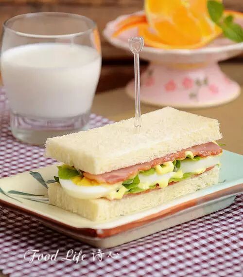 原料:汤种北海道土司两片、培根两条、鸡蛋2个、生菜2片、沙拉酱适量