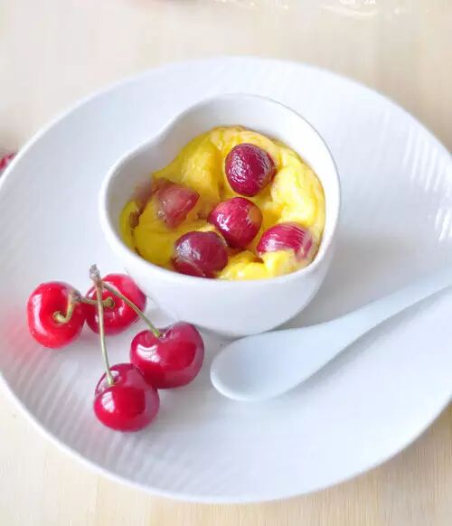 原料:鸡蛋2个、面包片2片、糖40克、牛奶250克、香草精适量、樱桃适量