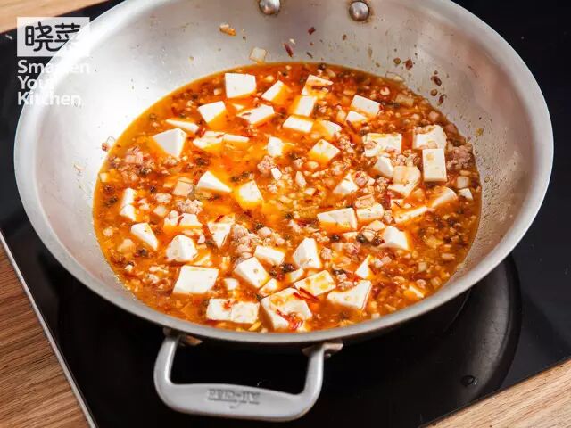 3)再放入肉末翻炒,放入豆腐,加入开水,大火炖开后转中火炖10分钟。