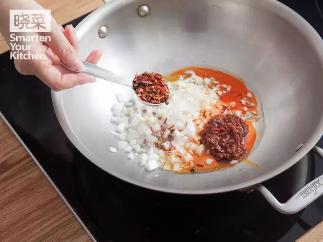 2)放入豆瓣酱和黄飞红的香料煸香。