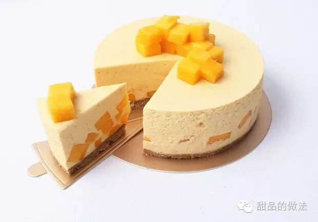 【脱模小窍门】用热毛巾在蛋糕模外圈热敷一会,然后向上顶出来~就能很轻易的脱模了哟~然后用扁平的刀在底部兜底转一圈,再找一个刀托着转移到蛋糕纸托上,然后把之前切好的芒果丁放到慕斯蛋糕中间即可。