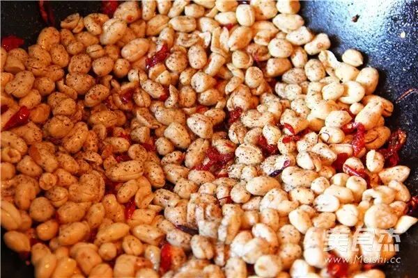 锅内留少许油,放入辣椒丝和花椒小火炒香,入花生一同翻炒,不停翻炒,撒上少许花椒粉,加入盐和糖。