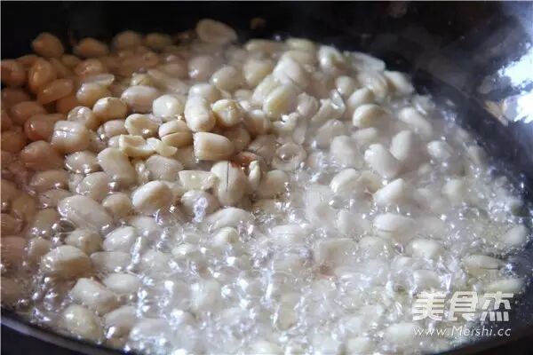 起油锅,放入适量油,放入花生,将花生炸至表皮变黄,感觉花生变干后捞出控油。