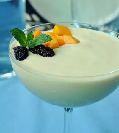 3、搅拌好奶昔倒入杯中,用适量的芒果块,和桑椹,薄荷叶装饰即可。