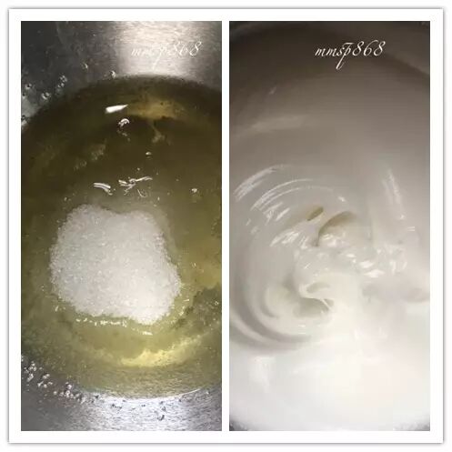 将糖水立即倒入蛋白中,并用高速搅打蛋白,使之降温(用手摸盆,降到差不多常温即可)