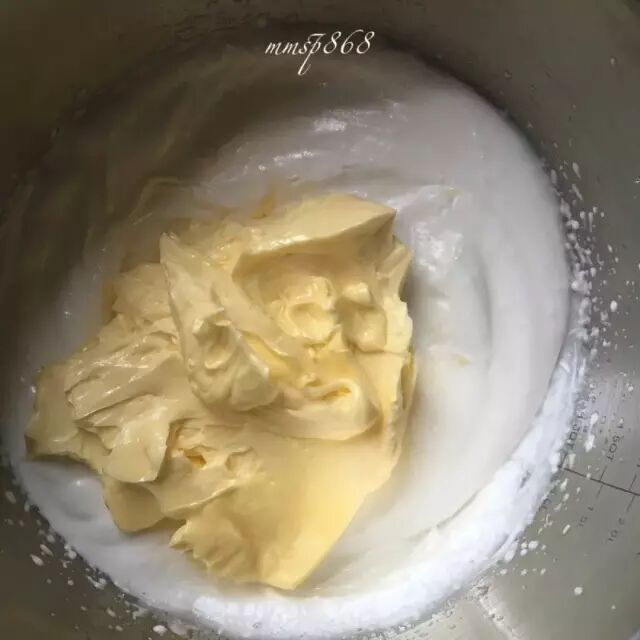 把打过的黄油全部放入蛋白中搅打,一开始,可能呈豆腐渣状,不用担心,继续搅打