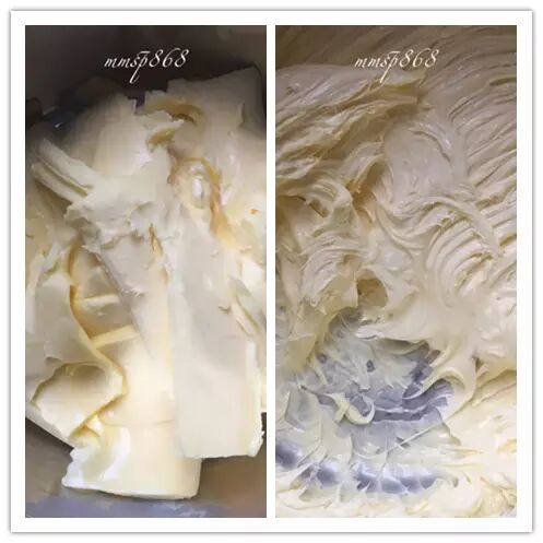 然后开始做奶油霜,这个时候黄油已经软化好了,用打蛋器将奶油打至顺滑发白