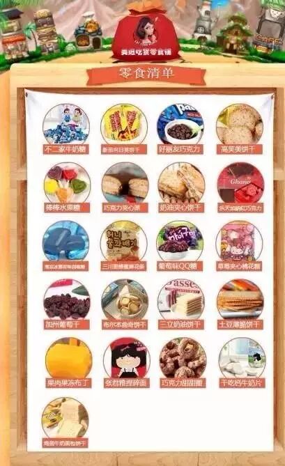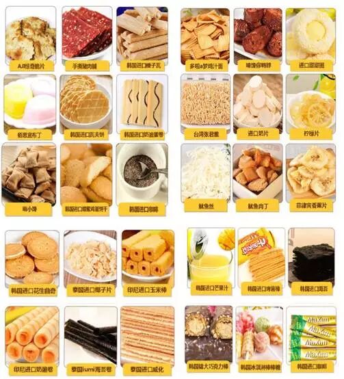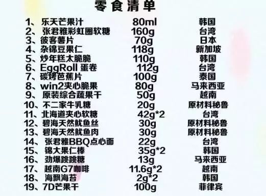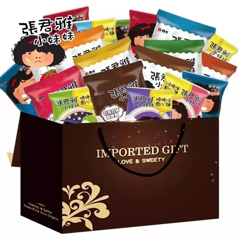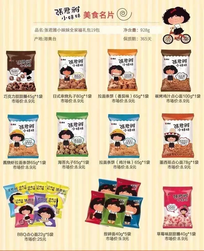 张君雅小妹妹——来自台湾的零食系列,捏碎面、点心面、休闲丸子、巧克力甜甜圈是其特色的产品,全部包含在大礼包中,有11种零食,总共19包