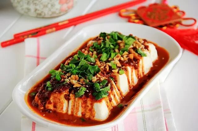 8、调味汁淋在豆腐上、喜欢吃辣的可以在加一勺辣椒油、就OK了
