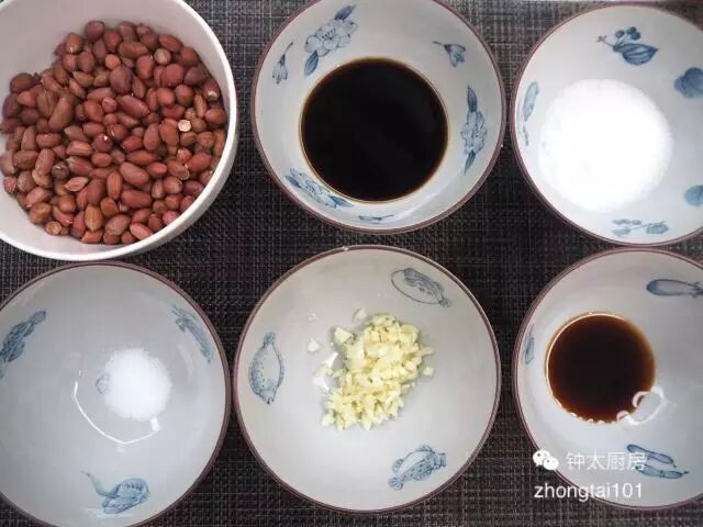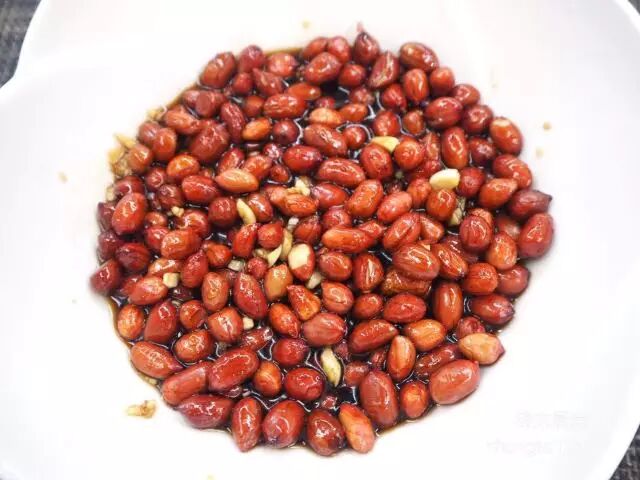 材料:红皮花生、陈醋、白糖、蒜末、白酒、生抽、盐;