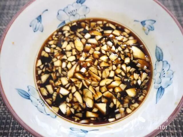 5、等花生米晾凉的时候可以调制醋汁,4勺的醋汁里加入2大勺白糖,再加入少许生抽、少许盐、蒜末一起搅拌;