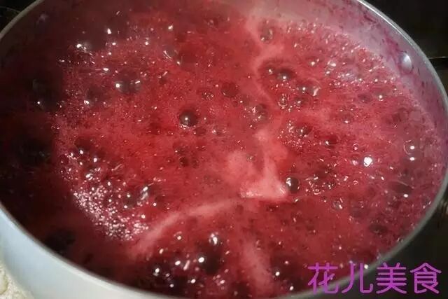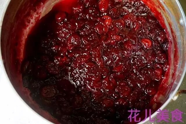 11.去除掉沫沫,水分大量减少,现在已经能闻到浓浓的樱桃酱味了。改大火,再有个2-3分钟来收汁。