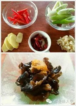 2.红干椒切段与花椒粒放一起;葱、红尖椒斜切成段;姜切片(5~7片);蒜拍一下,粗切成蒜碎。木耳去根洗净。