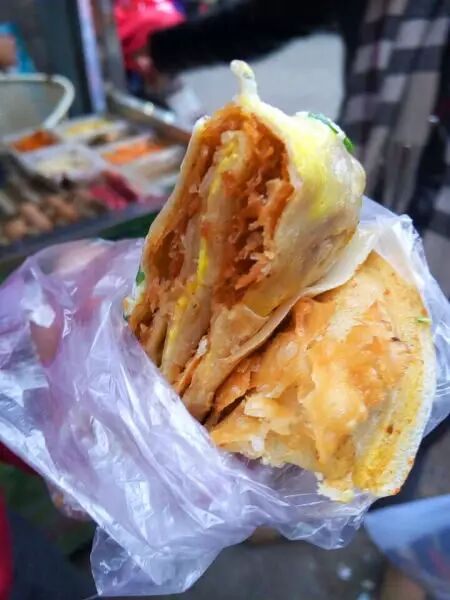 天津鸡蛋煎饼在上饶各小街小巷都能看到的它的身影。一勺面浆,铺在上面,敲入鸡蛋,撒上葱花,抹上辣酱,夹几把好吃的菜馅,包在一块,哇~现在想想口水都会留下来呢。