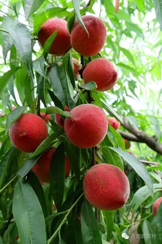 红蜜桃羞答答地掩映在绿叶之间,等君采撷。