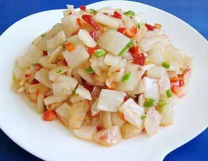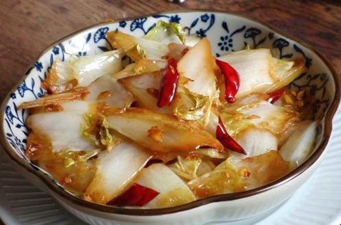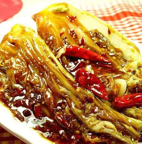 12)加胡椒粉拌均匀; 10、鱼香白菜粉皮 食材: 猪五花肉200g、白菜300g、粉皮1张、豆豉适量、郫县豆瓣酱适量、陈醋适量、白糖适量、盐适量、酱油适量、生姜适量。 做法: 1)白菜择洗干净,用手撕成大块,粉皮用剪刀剪成需要的大小,用水泡软。 2)用陈醋、白糖、少许精盐、酱油调成料汁。 3)五花肉切薄片,码放入锅,小火煎制出油。 4)放入生姜片,炒香。 5)放入一汤匙郫县豆瓣酱、少许豆豉,炒香。 6)放入撕好的白菜块,撒少许精盐大火翻炒均匀后改小火炖5分钟。 7)放入泡好的粉皮,(可加少许清水),小火翻炒至熟。 8)倒入调好的料汁,大火翻炒均匀后即可出锅。 11、快手小泡菜 (这里以卷心菜为例,白菜也可以这么做) 食材: 卷心菜200g、盐1汤匙、花椒、生姜、白糖1汤匙、白酒2汤匙、姜适量、青椒50g、红尖椒10g。 做法: