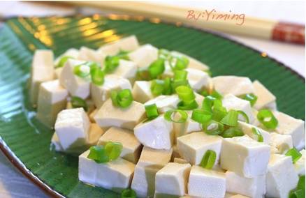 4、均匀淋在豆腐上,撒上小葱即可。