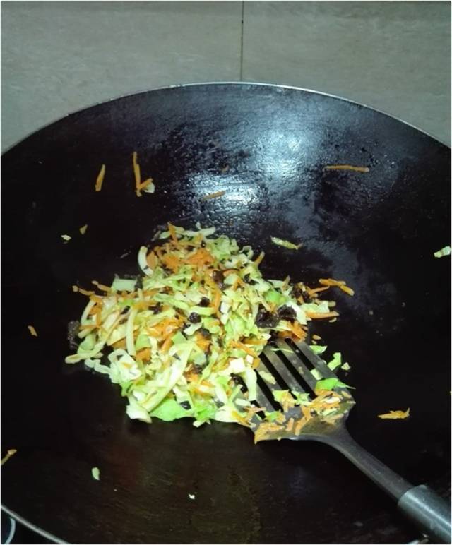 材料:低筋面粉300克,水160克,(干)酵母2克,糖10克,卷心菜100克,猪肉馅100克,红萝卜100克,木耳(水发)20克,食用油少许,生抽适量,盐适量,葱适量(大家可以根据自己的喜好准备馅料儿哦)