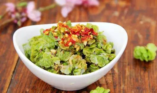 原料:榆钱(适量)、面粉(适量)、精盐(适量)、凉拌醋(适量)、味极鲜酱油(适量)、油泼辣椒(适量)、大蒜(适量)。