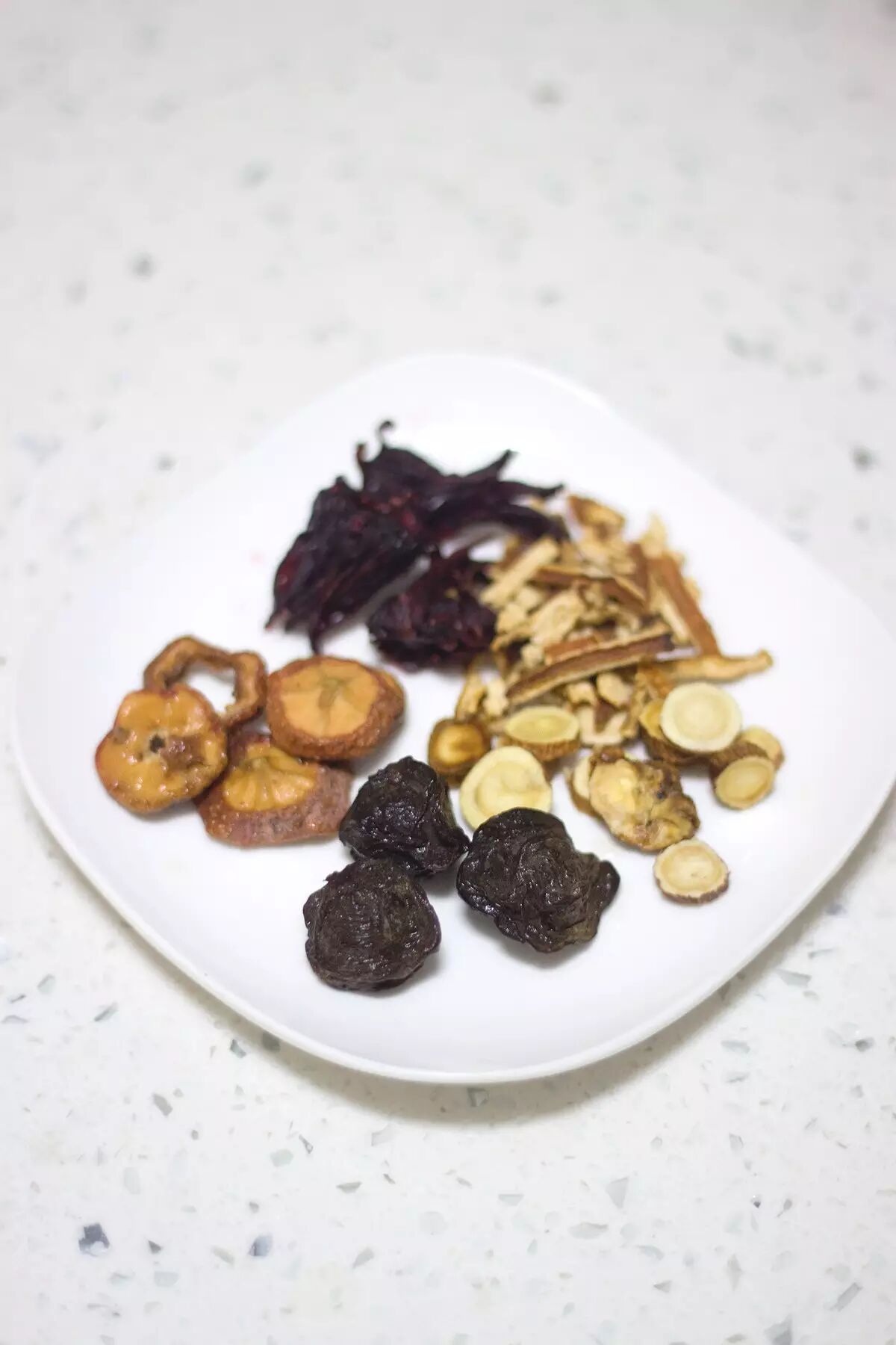 原料:乌梅7-8颗、甘草5-6片、干山楂适量、陈皮适量、洛神花3-4朵、干桂花少许,冰糖适量。