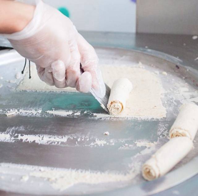 做法非常有趣,和我们国内煎饼果子的烙饼锅一样,不过它采用的是冷锅技术,保证温度低于-20°C。然后把冰淇淋材料平铺在上面,用铲刀将它卷起