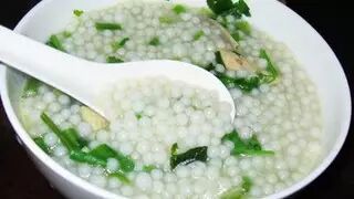 将米浆制成雪白透明的珍珠粉,在锅中煮熟捞出兑入鲜美的鸡汤,放上烫好的青菜即可。 吃起来滑溜鲜美,老少皆宜,营养丰富,可以养胃去火。