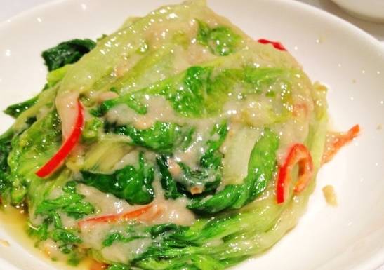 10、煮开后烹入水淀粉搅匀成酱汁淋到包好的生菜包上,即可。
