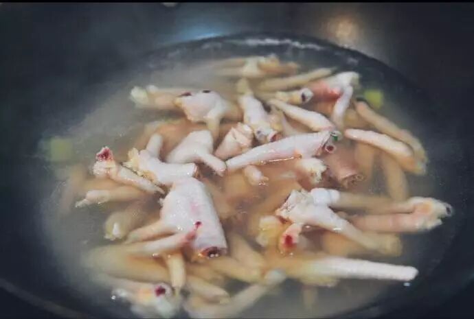 2、 锅里面放几片生姜,放入清水,煮开,将鸡爪放入锅中,大火煮沸,然后再煮10分钟。