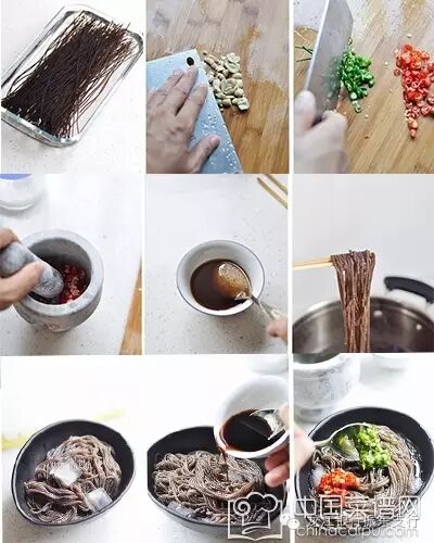 辅料:精盐2g、花生100g、大蒜20g、青红尖椒30g、白糖15g、陈醋30g、凉拌酱油10g、红油5g、香菜5g、冰块