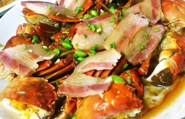 六月黄吃法的新宠。也是将螃蟹一切二,然后放入几片咸肉、少许毛豆进去,伴以葱、姜、高汤和油,就可以上笼蒸了,大火十分钟左右,一道咸肉蒸六月黄可以开吃了。有人管这道菜叫“古法蒸六月黄”所谓的古法,就是不用外来的调料,而是通过蒸汽把咸肉中的咸味逼进蟹肉之中这样蒸出来的“六月黄”,能品尝出两种不同的肉香味。