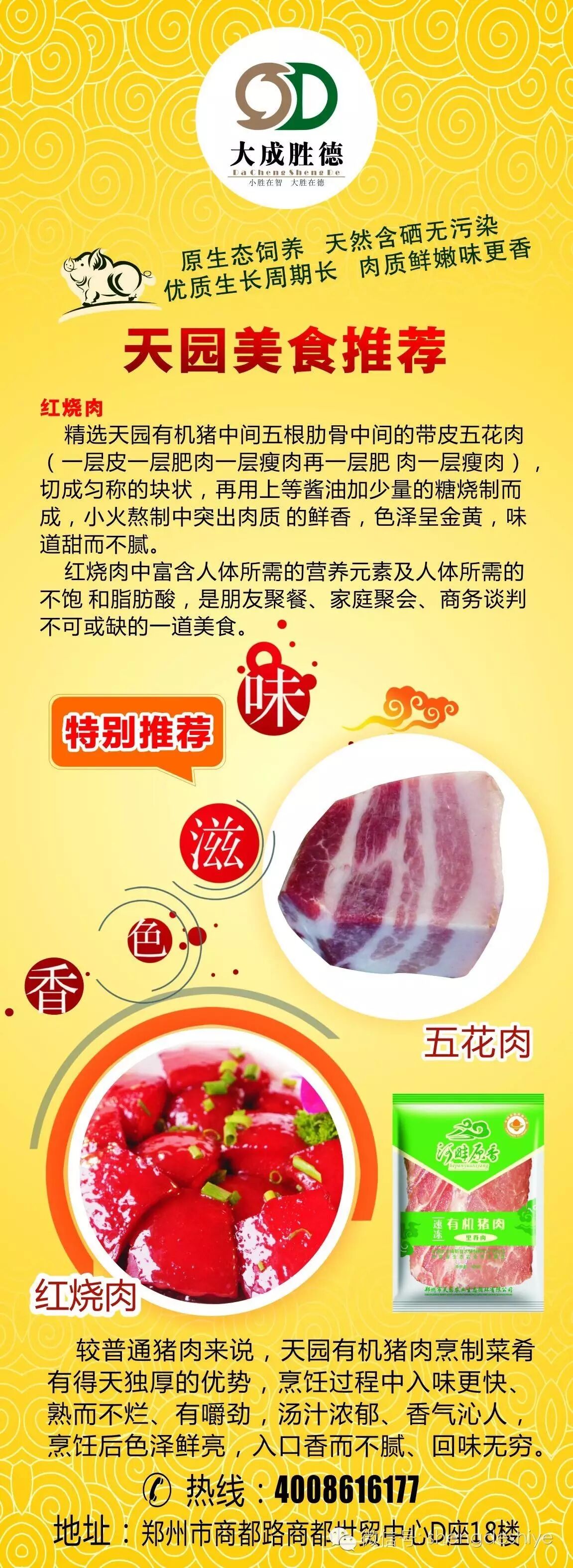 天园公司养的有机猪肉经农业部检测中心、河南省中医学院药学院检测发现富含人体所需的蛋白质、不饱和脂肪酸、矿物质和微量元素,特别是硒、钙、铁、锌、镁、磷、油酸、亚油酸、亚麻酸、二十碳一烯酸、二十二碳六烯酸、棕榈油酸、十八碳烯酸、二十碳二烯酸、花生烯酸、二十四碳烯酸、京尼平苷酸。硒是降血压、防癌、抗癌的核心元素,能有效抑制癌细胞的生长。