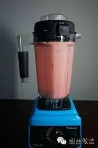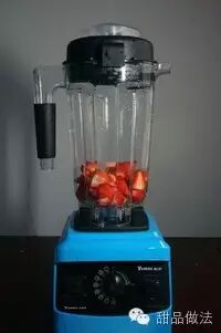 4、我用的是维仕美的破壁机,将切块的草莓放入容器,坐在机器上。