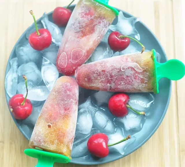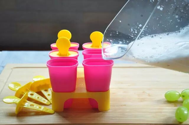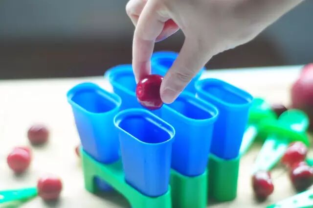 将果汁倒入模具,其中也可添加去核的樱桃果肉,使棒冰的口感更加丰富,然后冷冻一晚。