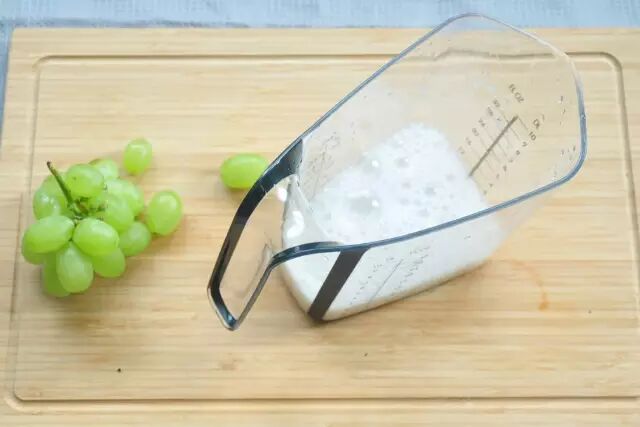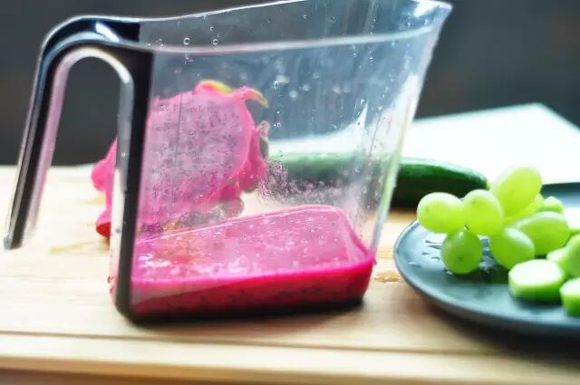 将火龙果切开,黄瓜切成片,与葡萄一起放入榨汁机内榨汁。