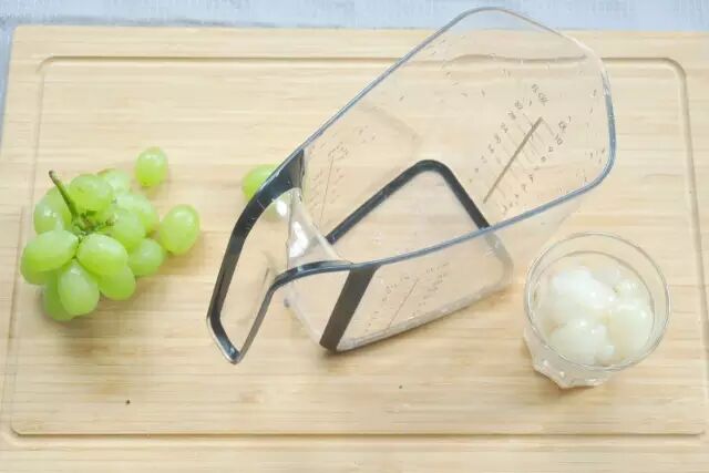 在模具中放入一颗葡萄,再倒入荔枝汁,放入冰箱中冷冻一晚。