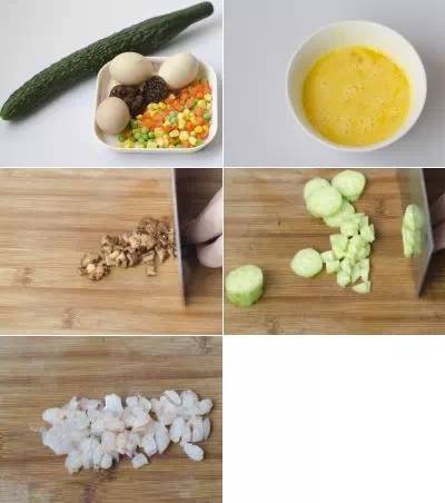 剩饭500g、青瓜20g、鸡蛋50g、杂蔬100g、香菇10g、虾仁20g