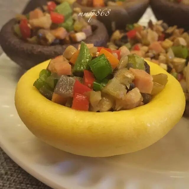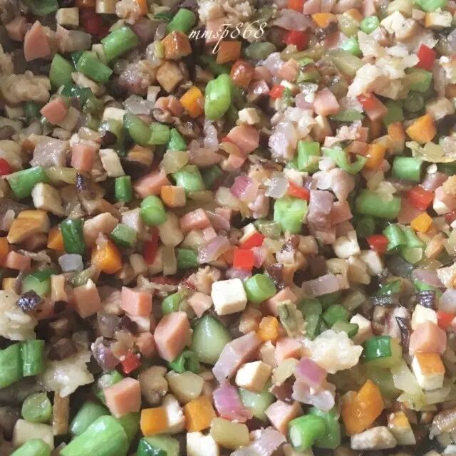 再放入香肠丁,翻炒变色后盛到放肉丁的碗里