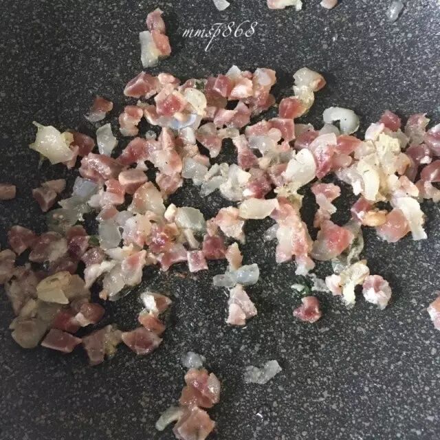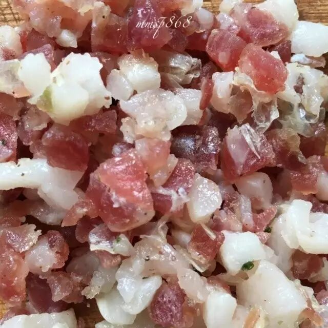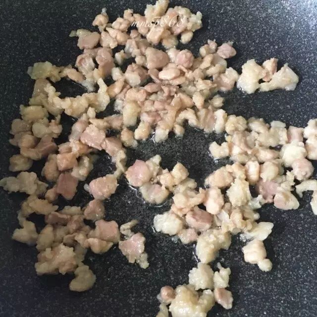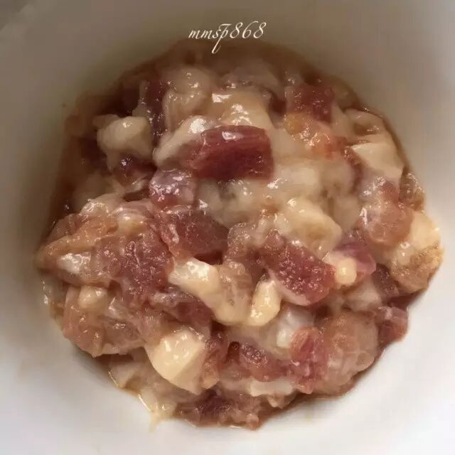五花肉切丁,用生抽、一点白糖、一点料酒、生粉捏匀,然后倒一点点油搅拌均匀,备用