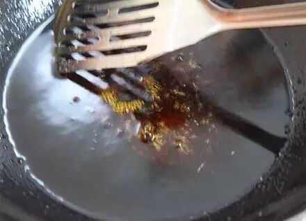 3、 将炒锅微微烧热,倒入适量的植物油,放入冰糖,小火炒化。
