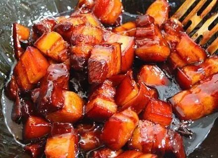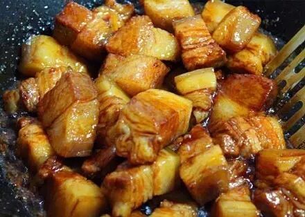 5、 将熟的五花肉倒入锅内,转中火,快速翻炒,让每块肉都沾上糖色。