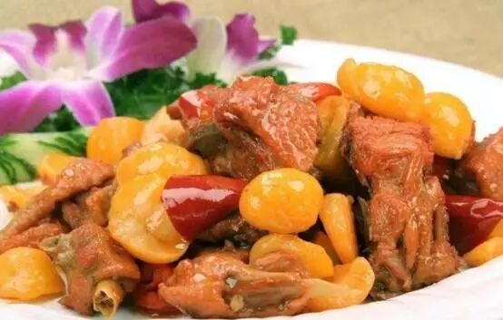 天师板栗烧土鸡,鹰潭市的传统名菜,江西鹰潭龙虎山出产的天师板栗,个大香甜,淀粉丰富,是历代天师特别喜爱的果品和滋补品,素有“人间仙果”之称。而这钵天师板栗与当地农家喂养的土鸡相配,在文火中慢慢地烧出来的“天师板栗烧土鸡”,油光发亮,清香思溢,是这里很有名的美味佳肴,能吃这道菜,可谓“国 宾”的待遇。