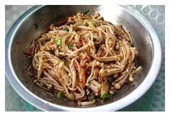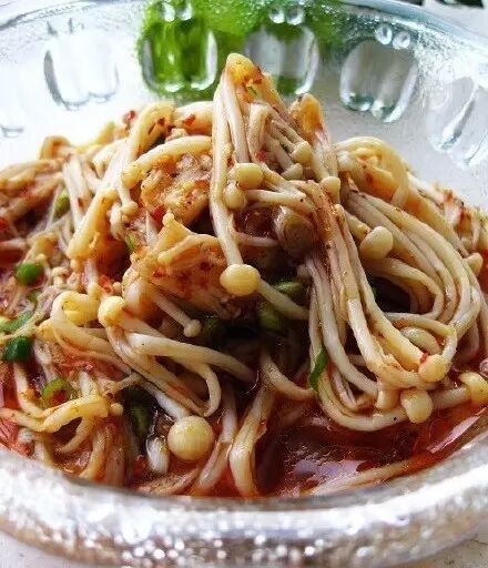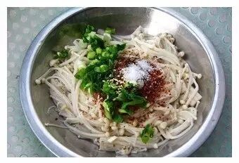 5、将辣椒、花椒、葱末、盐、鸡精、醋、生抽、香油倒进金针菇中,盐可以适量,醋不要加太过,如果加如芥末,那辣椒花椒都不要再加。