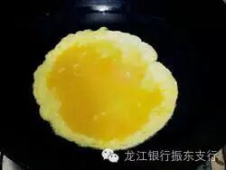 3.热锅下油,将蛋液放下去,改小火,结块后把蛋皮切碎装碗。