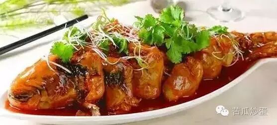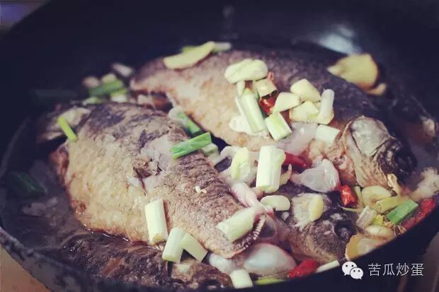 把整条鱼放在油锅里,炸到金黄,再捞出来,放在盘子里。锅里留些油,放生姜沫和蒜末炒香,然后放高汤、盐、糖、酱油,还有辣椒酱,炒匀,和葱花一起淋到鱼身上、