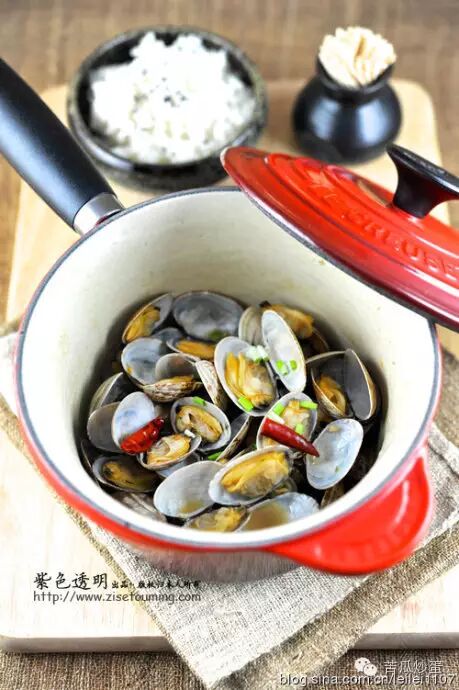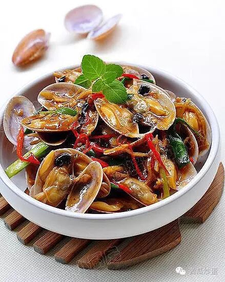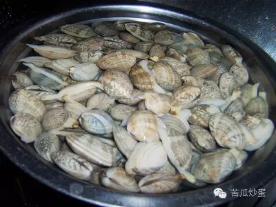 用淡盐水浸半小时让花蛤吐出泥沙,然后洗干净,用开水都烫开口。